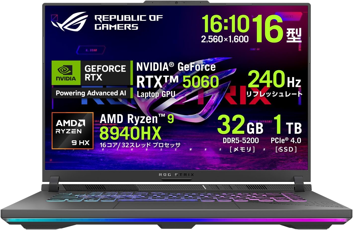 GPUにはハイスペックな「RTX 5060」を採用。16インチのディスプレイは高精細なWQXGA解像度と240Hzの超高速リフレッシュレートに対応しています。
