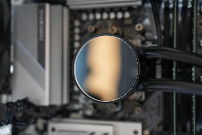 水冷CPUクーラーのヘッド部分は鏡面。LED無しでもほかパーツとマッチしています。