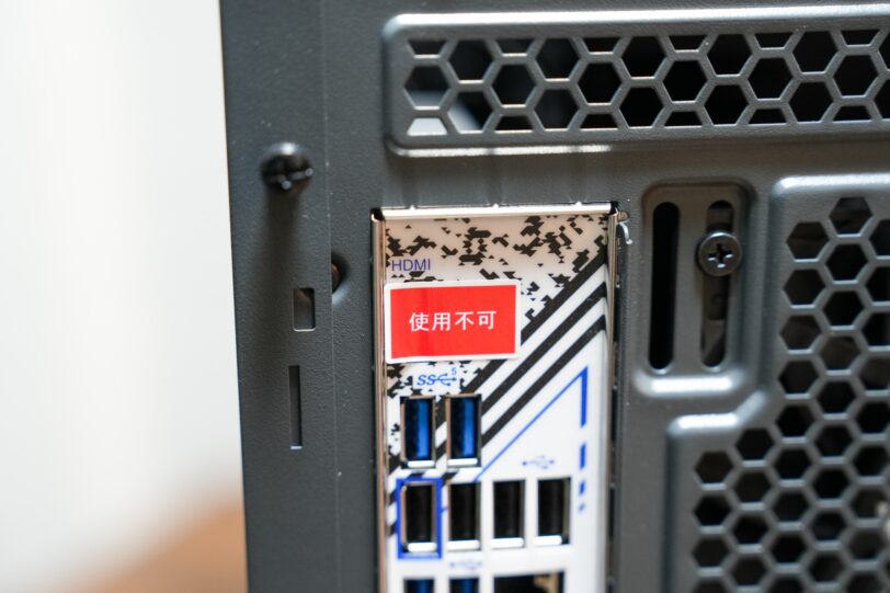 背面には、誤ってマザーボード側のHDMIとモニターを接続してしまわないよう、使用不可シールが貼られています。