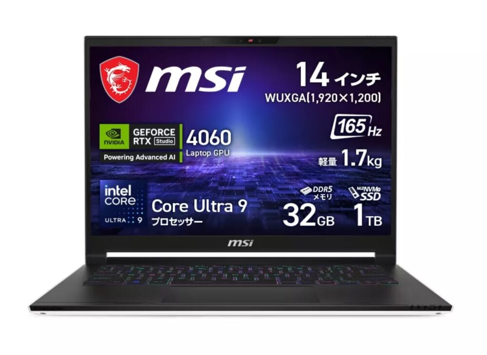 「Stealth-14-AI-Studio-A1VFG-5539JP」はIntelのAI搭載CPU「Core Ultra9 185H」を搭載したMSIの小型ゲーミングノートPC。